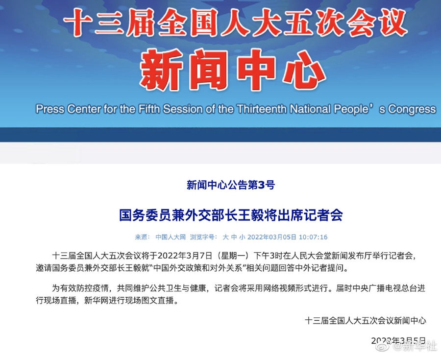 十三屆全國(guó)人大五次會(huì)議將于3月7日(星期一)下午3時(shí)在人民大會(huì)堂新聞發(fā)布廳舉行記者會(huì),邀請(qǐng)國(guó)務(wù)委員兼外交部長(zhǎng)王毅就“中國(guó)外交政策和對(duì)外關(guān)系”相關(guān)問題回答中外記者提問。