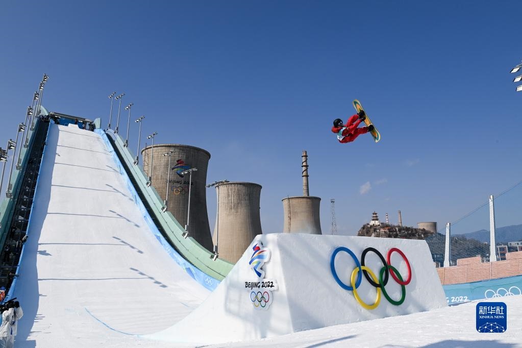 北京2022年冬奧會(huì)單板滑雪男子大跳臺(tái)決賽在北京首鋼滑雪大跳臺(tái)舉行。這是加拿大選手達(dá)西·夏普在比賽中(2月15日攝)。