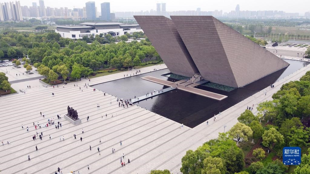 游客在渡江戰(zhàn)役紀(jì)念館參觀游覽(2021年5月3日攝,無(wú)人機(jī)照片)。新華社記者 周牧 攝